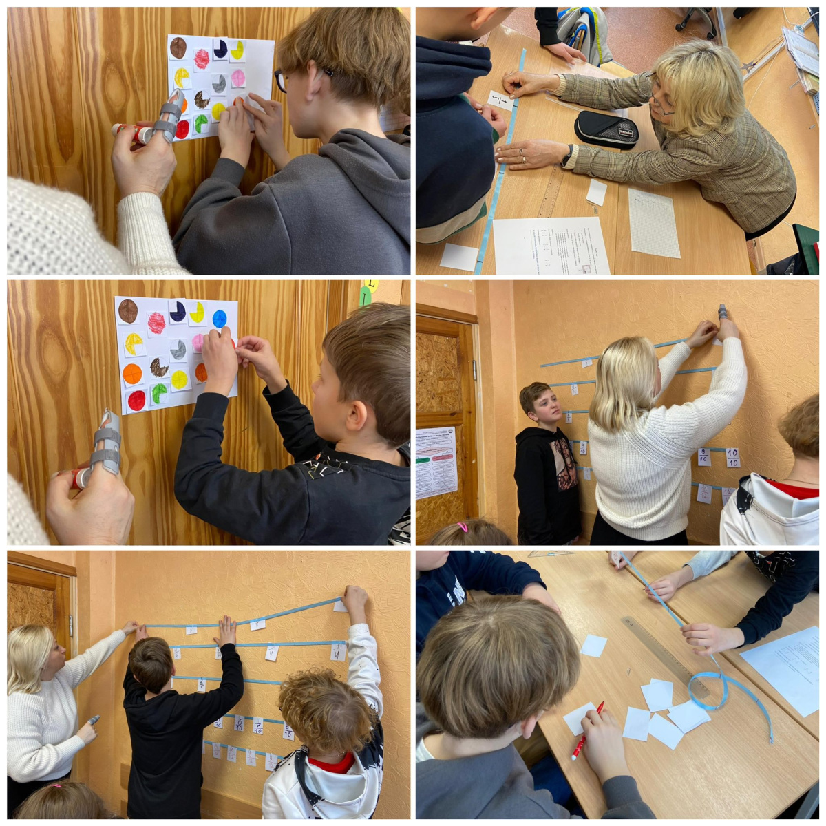 Praktiskajā uzdevumā bija jāsadala skaitļu taisne (lente) noteiktās vienādās daļās un jāattēlo uz tās daļskaitļi, izprotot to novietojumu. Stundas laikā skolēni nostiprināja prasmi pazīt, nosaukt un pierakstīt daļskaitļus ar nelieliem saucējiem, kā arī tos modelēt.