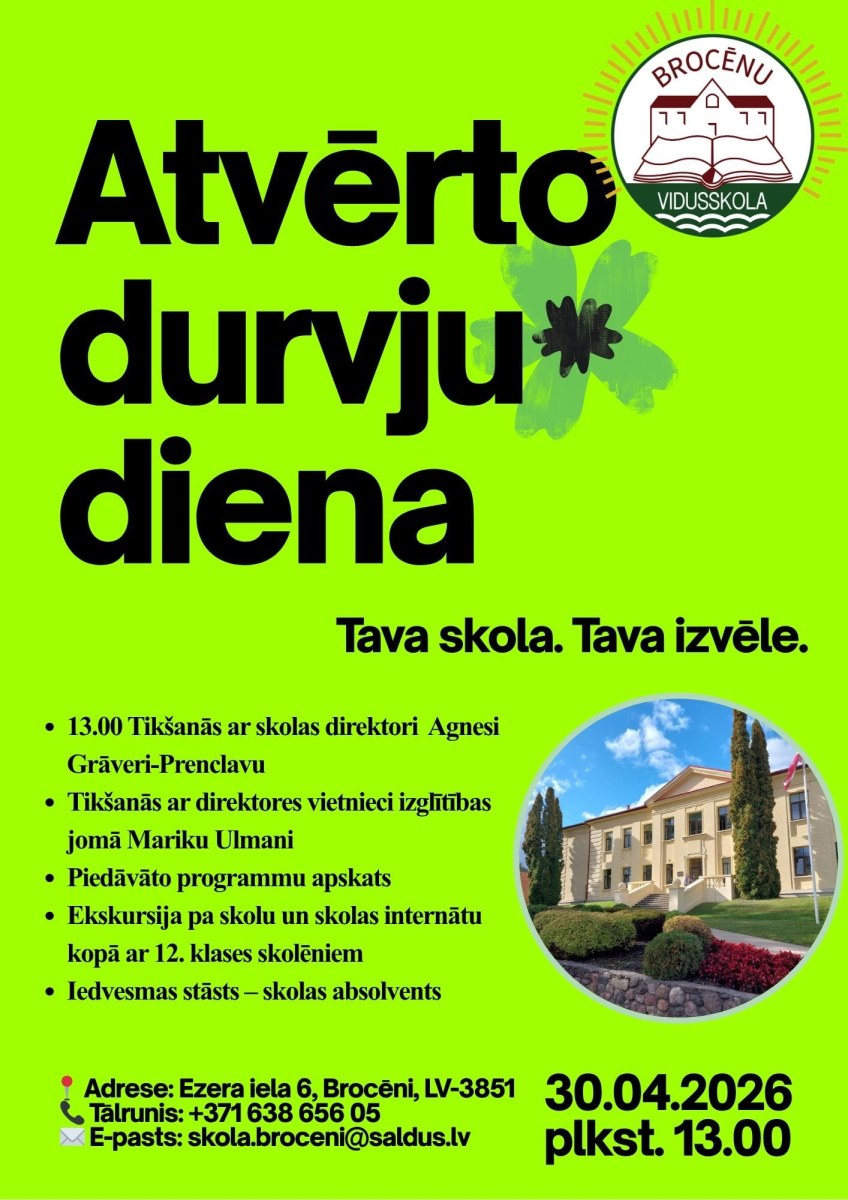 Aicinām skolēnus un vecākus iepazīt Brocēnu vidusskolu, tās vidi, cilvēkus un iespējas. Tā būs lieliska iespēja satikt skolas vadību, uzzināt vairāk par piedāvātajām programmām, doties ekskursijā pa skolu un internātu, kā arī iedvesmoties no absolventa stāsta.