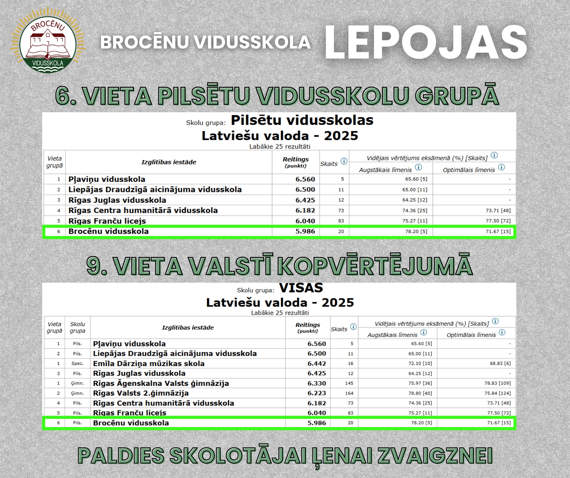 Draudzīgā aicinājuma fonda reitingā, kas balstīts Valsts izglītības attīstības aģentūras apkopotajos datos par centralizēto eksāmenu rezultātiem, LATVIEŠU VALODAS eksāmenā esam uzrādījuši īpaši augstus rezultātus - 𝟔. 𝐕𝐈𝐄𝐓𝐀 pilsētu vidusskolu grupā 𝟗. 𝐕𝐈𝐄𝐓𝐀 valstī kopvērtējumā Augstie eksāmena rezultāti apliecina mūsu skolēnu ieguldīto darbu, apņēmību un vēlmi sasniegt...