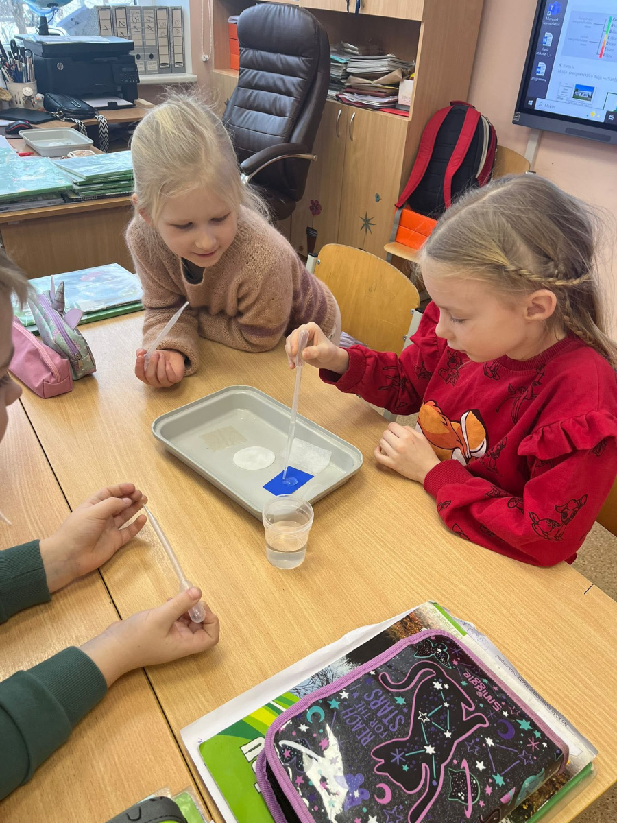1.a un 1.b klases dabaszinību stundā pārvērtāmies par īstiem mazajiem pētniekiem Pētījām četru dažādu materiālu mitrumizturību un ar interesi atklājām, kuri materiāli ūdeni uzsūc, bet kuri paliek sausi. Ar lielu prieku un centību mācījāmies izmantot pipeti, pilinot ūdens pilītes un sajūtoties kā īstā laboratorijā Stunda...