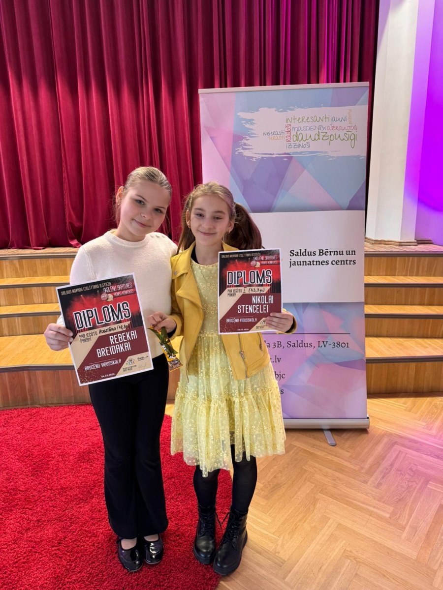 Saldus novada skolēnu skatuves runas konkurss 2026 Lepojamies ar mūsu skolas skolēnu panākumiem Saldus novada skolēnu skatuves runas konkursā! Augstākā pakāpe Rebeka Breidaka (5.a) – sagatavoja skolotāja Daiga Staško 1. pakāpe Fēlikss Millers (3.b) – sagatavoja skolotāja Svetlana Tarasova Nikola Stencele (4.a) – sagatavoja skolotāja Anete Bērtaite Ketija Zalkovska...