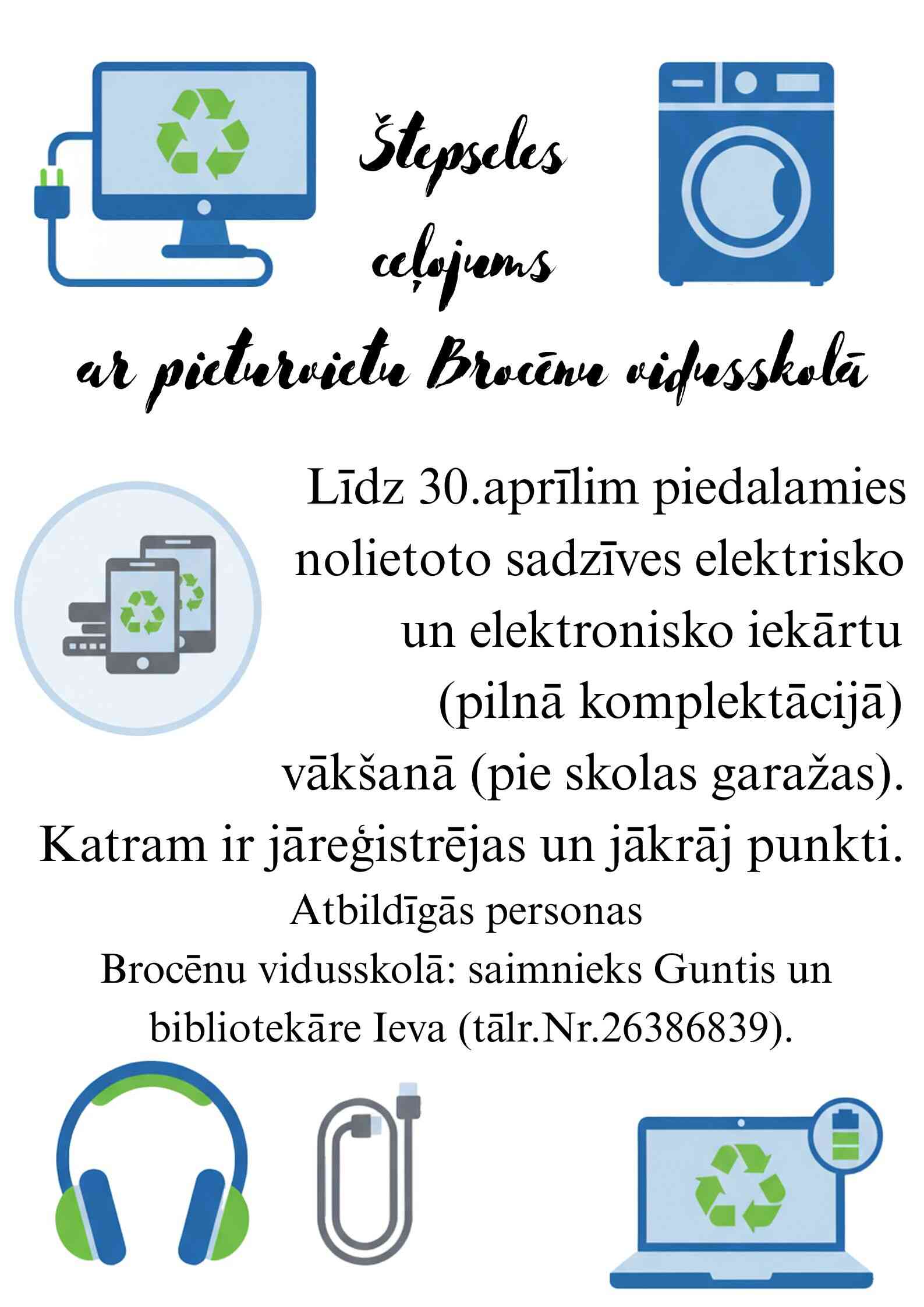 Štepseles ceļojums turpinās Brocēnu vidusskolā! Aicinām ikvienu iesaistīties un līdz 30. aprīlim nodot nolietotās sadzīves elektro un elektroniskās ierīces (pilnā komplektācijā) pie skolas garāžas. Kopā rūpēsimies par vidi un dosim lietām otro dzīvi!Reģistrējies un krāj punktus! Ja rodas jautājumi – droši sazinies ar atbildīgajām personām skolā. ...